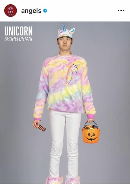 大谷選手の仮装は「ユニコーン」で、ピンク、紫、黄色などが配されたタイダイ柄のトップスにブーツ、角と耳がついたユニコーン・キャップをかぶっていました。このユニークな仮装は、ファンから大ウケでした。