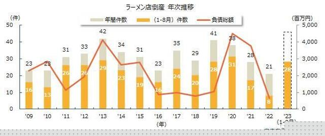 2023年の1月から8月までの間に、「ラーメン屋さん」の倒産が前年同期比で3.5倍に急増しました。これは、食材価格と光熱費の高騰が主な原因とされています。